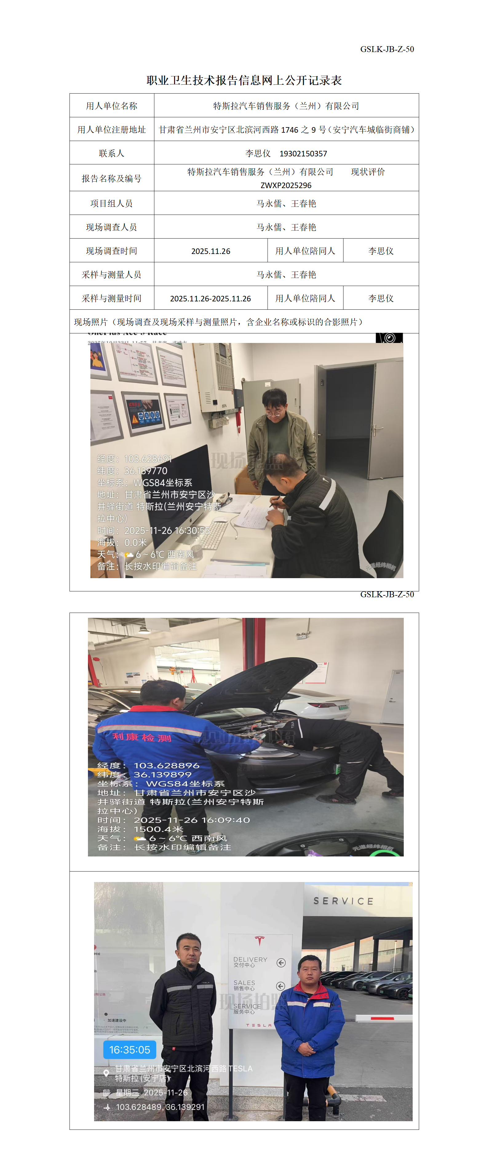 特斯拉汽车销售服务(兰州)有限公司职业病现状评价信息公示表