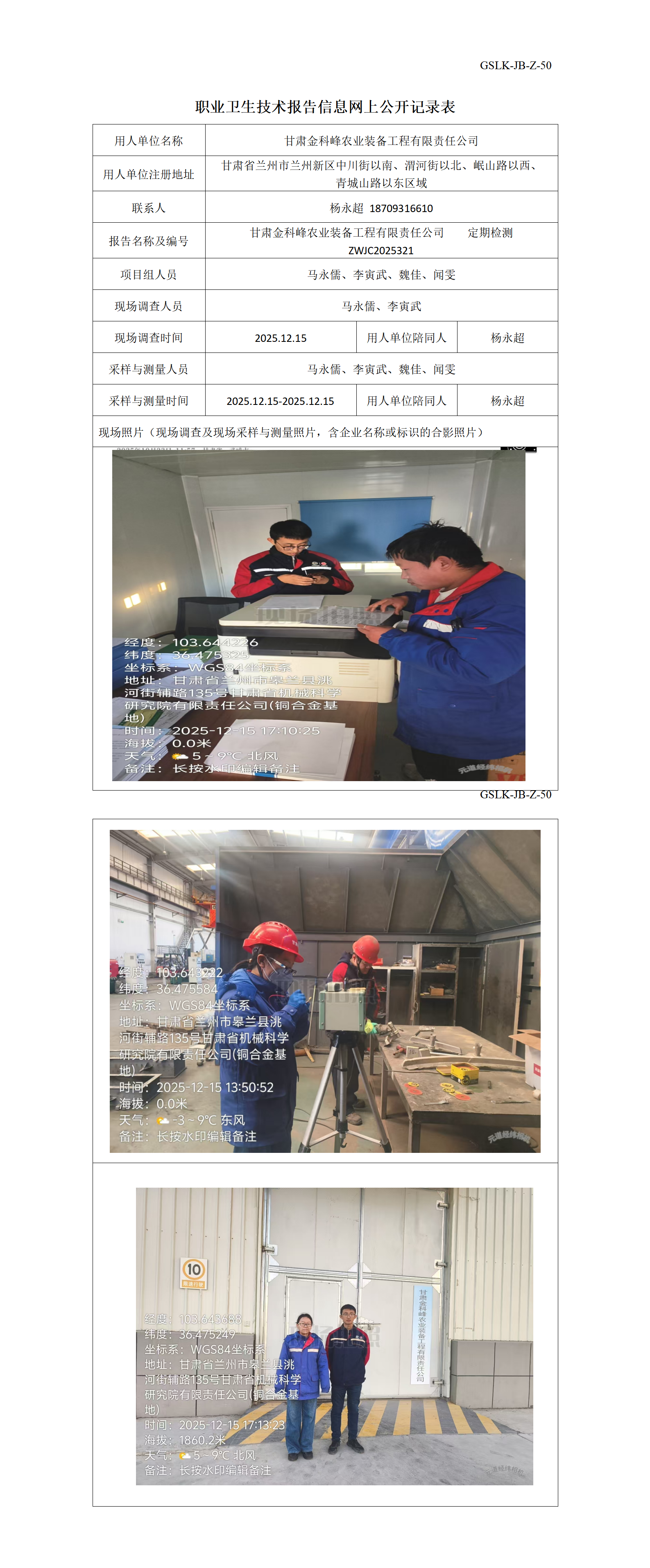 甘肃金科峰农业装备工程有限责任公司定期检测信息公示表